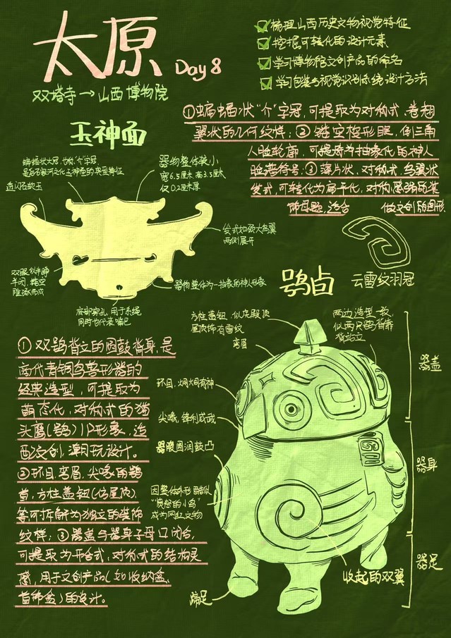 大同与太原的考察则更注重艺术与设计的融合实践。在云冈石窟,师生们探讨石窟艺术的现代化再设计路径;在大同市博物馆、山西博物院,研究展品陈列的视觉逻辑与文创产品的设计方法。此次研学还特别设置专业交流环节,师生们走进山西怀冰艺术社,学习独立艺术机构的品牌VI系统构建;与山西传媒学院师生座谈,围绕文化传承中的设计介入路径、跨学科合作模式展开深度交流,进一步拓宽了设计视野。在考察结束后,同学们收获良多,认识传统文化,学习传统文化,为创新寻找古人的智慧结晶。大家热情高涨,创作了手账记录。如下: