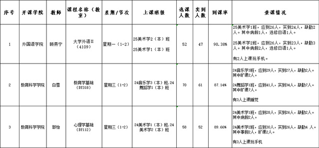 相关情况已向带班辅导员反馈核实,提醒加强学生管理。根据学校督导查课反馈,我院对查课人员进行了重新调整,保证每天上午和下午同时有2位老师进行查课。重点对公共课的到课率进行查课,并通报旷课的学生。