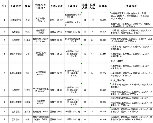 艺术学院查课范围包含周一至周五、上午、下午及晚上的5个时间段课程,涉及艺术学院各专业大一至大三年级523个课堂;覆盖博雅楼、四号教学楼、艺术学院东区艺术创新实践中心、老图书馆、7号教学楼、9号教学楼等艺术学院教学场所。