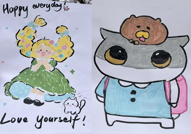 在“心理漫画DIY”创作摊位,彩笔、马克笔等创作材料摆放整齐,同学们紧扣“自我关爱”“情绪调节”核心主题现场创作。大家执笔勾勒、用心描绘,将对心理健康的理解、内心的美好期许与青春感悟融入一幅幅画作,生动温暖的简笔画跃然纸上,尽显少年心意与对心理健康的独特思考。